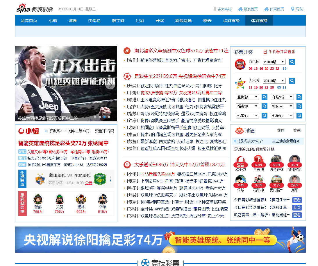 新浪彩票是国内专业值得信赖的彩票平台,全面覆盖包括体彩、福彩全部的彩票内容,涵盖双色球、大乐透、足彩、竞彩等彩种,为彩民提供彩票开奖结果查询,资讯,彩票走势分析等一体化服务!