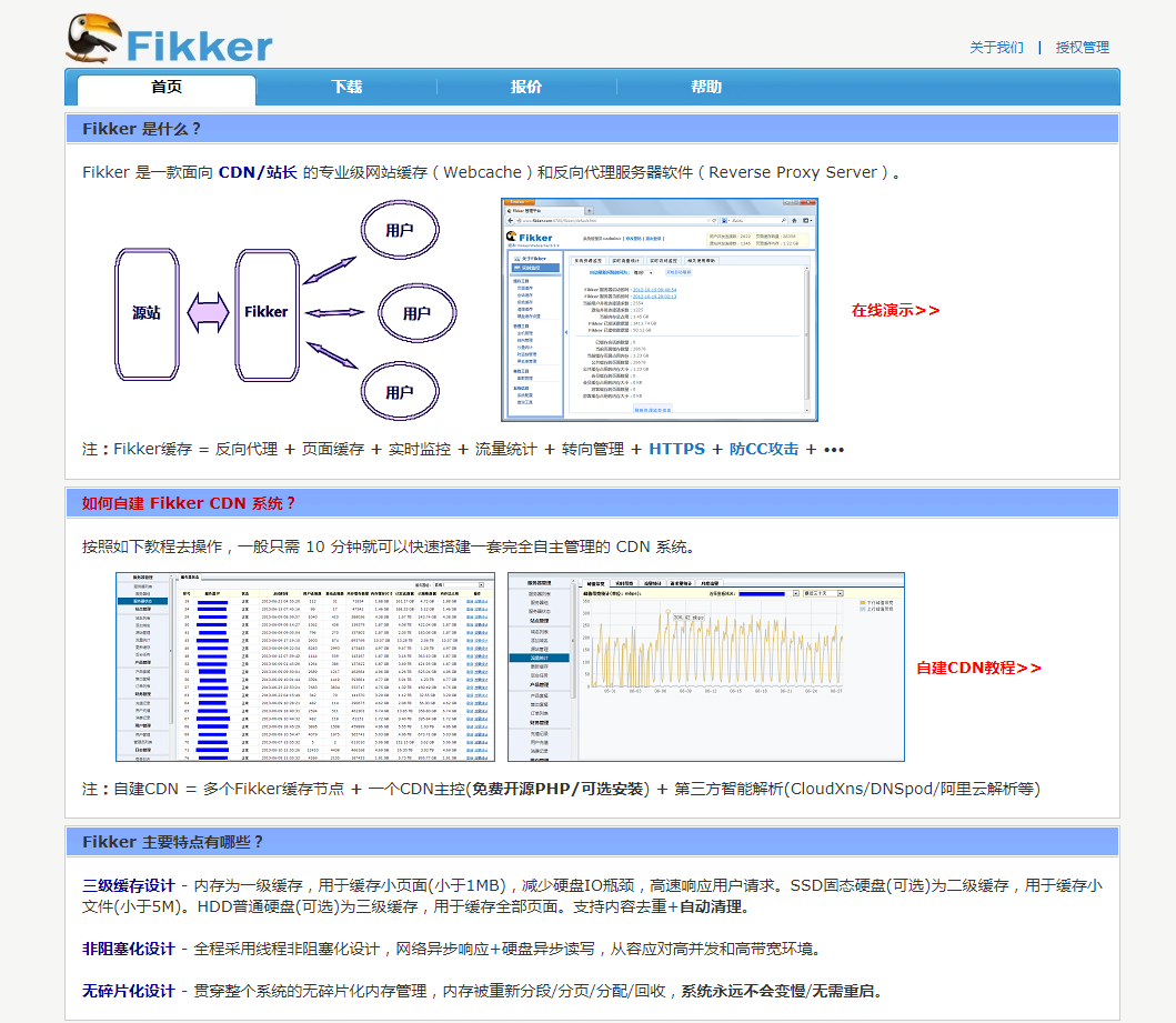 Fikker 是一款面向CDN/站长的专业级网站缓存(WebCache)和反向代理服务器软件(Reverse Proxy Server)。快速搭建/自建CDN系统 = Fikker缓存 + Fikker CDN主控(PHP免费开源) + 第三方智能解析(CloudXns/DNSpod/AliyunDNS)