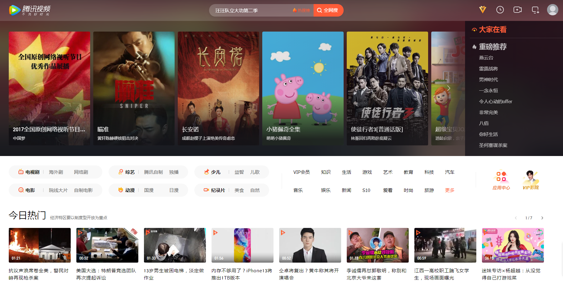 直接访问 类似网站 腾讯视频 - 中国领先的在线视频媒体平台,海量高清视频在线观看 站点名称: 腾讯视频 网址链接: http://v.qq.com 网站打分: 网站语言: 简体中文 所属分类: 影视 收录时间: 2020年11月05日 站长QQ: 暂无 累计点击: 3792人次 编辑人员: admin 百度权重: 搜狗权重: SEO查询: 立即查看 网站介绍 腾讯视频致力于打造中国领先的在线视频媒体平台,以丰富的内容、极致的观看体验、便捷的登录方式、24小时多平台无缝应用体验以及快捷分享的产品特性,主要满足用户在线观看视频的需求。 网站标签 腾讯视频,电影,电视剧,综艺,新闻,财经,音乐,MV,高清,视频,在线观看,全网搜,搜全网 人气走势
