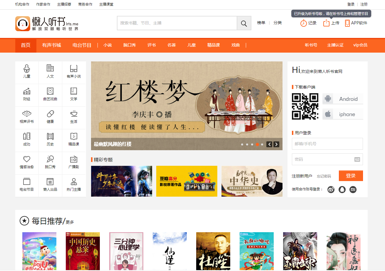 直接访问 类似网站 懒人听书 - 知名有声阅读平台,身边的有声图书馆 站点名称: 懒人听书 网址链接: http://www.lrts.me 网站打分: 网站语言: 简体中文 所属分类: 小说 收录时间: 2020年11月05日 站长QQ: 暂无 累计点击: 3719人次 编辑人员: admin 百度权重: 搜狗权重: SEO查询: 立即查看 网站介绍 懒人听书是3.5亿用户选择的综合性有声阅读交流平台。热门IP入驻,知名主播云集,原创小说、经典文学、海量精品栏目共筑有声阅读生态圈,解放双眼,畅听世界 网站标签 懒人听书,听书,有声阅读,有声小说,播客,主播,网络电台,收藏,赞,演播,原著,有声书籍,下载,高清,数字音频,社区 人气走势