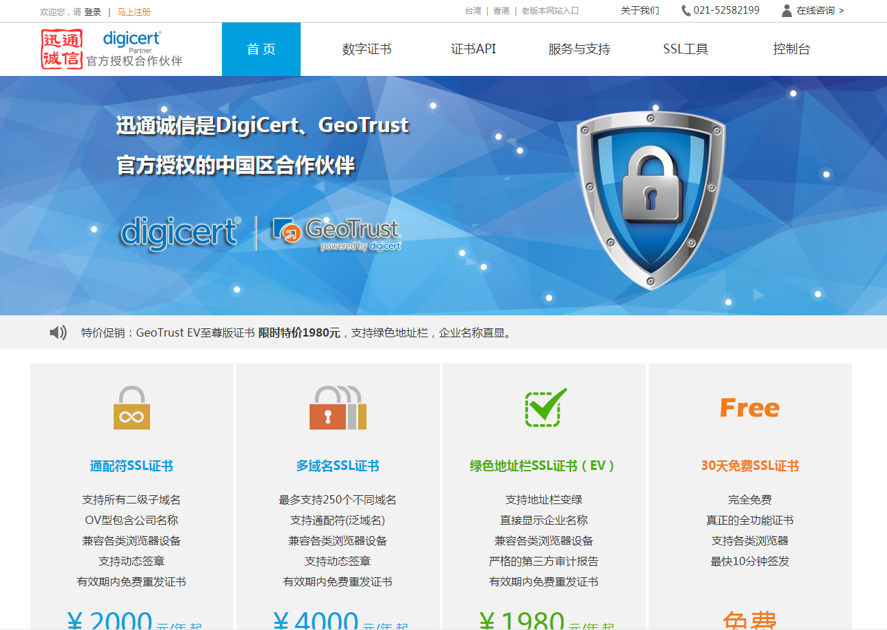 上海迅通科技有限公司是DigiCert SSL证书和GeoTrust SSL证书授权中国区合作伙伴,为您提供EV证书、OV证书、DV证书的一站式服务:证书申请,认证,安装,部署和疑难解答。您对SSL证书产品有任何疑问,请立刻拨打021-52582199,我们将有技术专家为您服务。