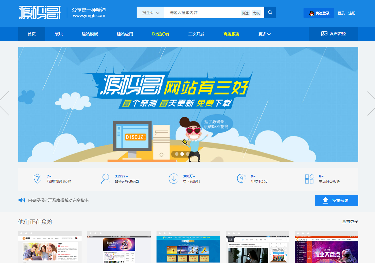源码哥(ymg6.com)资源覆盖免费dz插件、免费dz模板、免费dz教程、discuz二次开发、免费wordpress模板、微擎、微信小程序、phpwind企业模板、织梦企业模板、dedecms企业模版等多种类建站资源