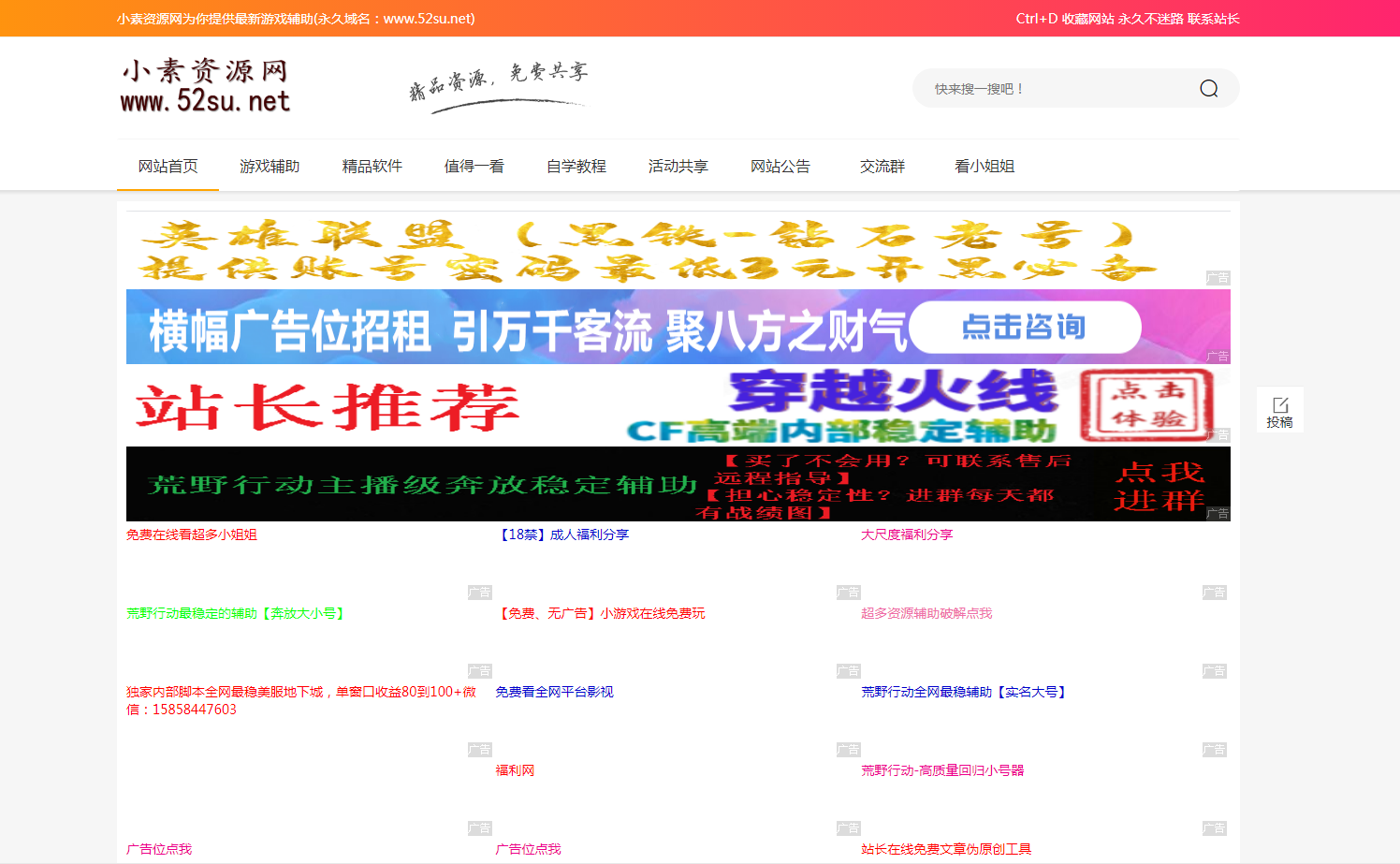小素资源网为(永久域名:www.52su.net)是一家乐享资源记忆点滴的网站,主要分享游戏辅助,程序源码,站长工具,网络技术,免费空间,模板插件,网赚项目,各类资源,各类教程,QQ资源,手机应用,致力创造一个高质量网络资源教程的分享平台